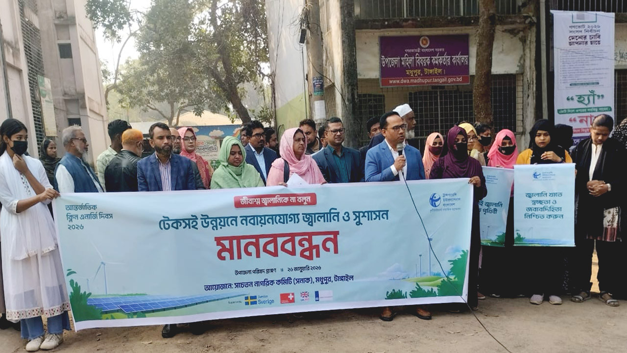 টাঙ্গাইলের মধুপুরে আন্তর্জাতিক ক্লিন এনার্জি দিবস ২০২৬ উপলক্ষে র্যালি, মানববন্ধন ও আলোচনা সভা অনুষ্ঠিত হয়েছে। মধুপুর উপজেলা প্রশাসন এবং টিআইবি'র অনুপ্রেরণায় গঠিত সচেতন নাগরিক কমিটি (সনাক) এর যৌথ উদ্যোগে এ কর্মসূচি পালিত হয়।