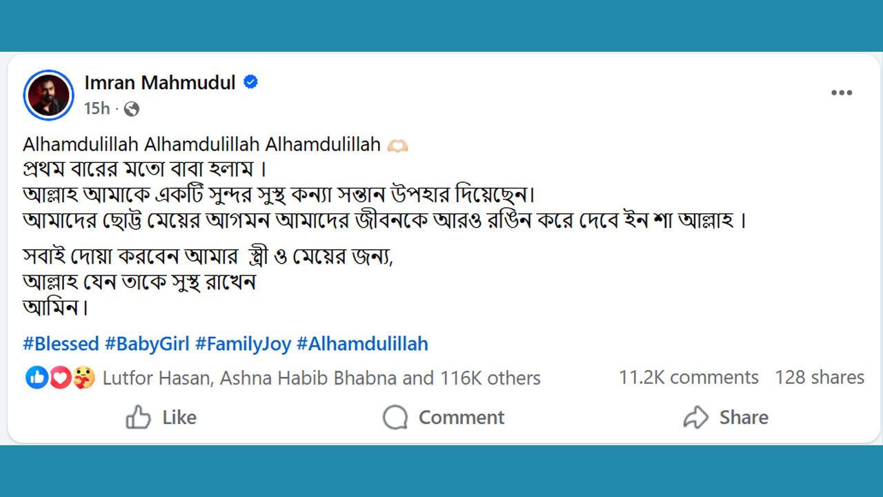 ইমরান লিখেছেন, “আলহামদুল্লিলাহ, প্রথম বারের মতো বাবা হলাম। আল্লাহ আমাকে একটি সুন্দর সুস্থ কন্যা সন্তান উপহার দিয়েছেন।” তিনি আরও বলেন, “আমাদের ছোট্ট মেয়ের আগমন আমাদের জীবনকে আরও রঙিন করে দেবে ইন শা আল্লাহ। সবাই দোয়া করবেন আমার স্ত্রী ও মেয়ের জন্য, আল্লাহ যেন তাকে সুস্থ রাখেন, আমিন।”