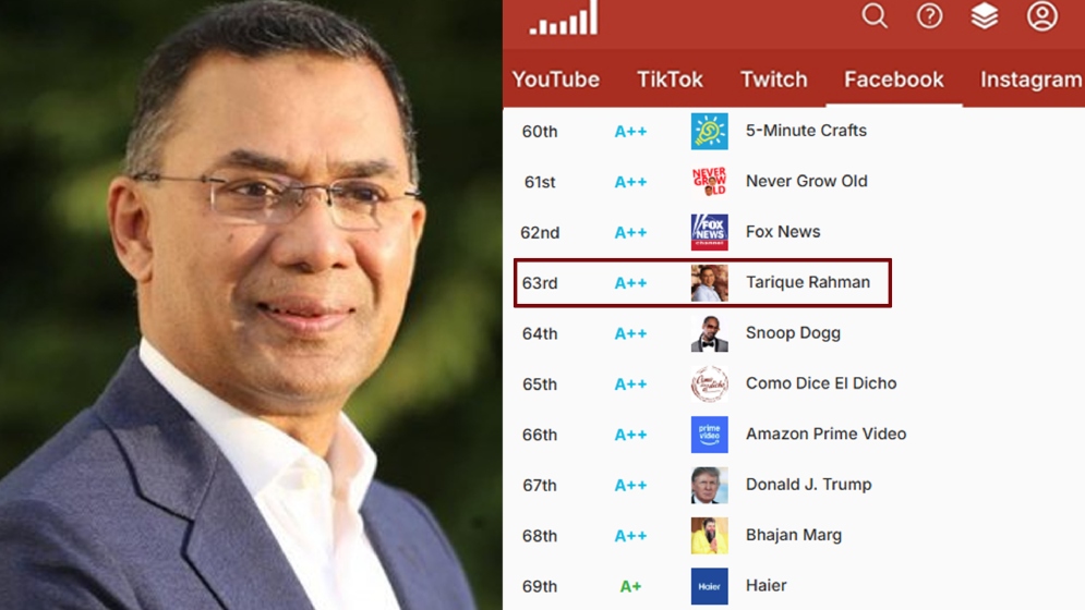 সামাজিক যোগাযোগমাধ্যম ফেসবুকে বিশ্বসেরা কনটেন্ট ক্রিয়েটরদের তালিকায় স্থান করে নিয়েছেন বিএনপির ভারপ্রাপ্ত চেয়ারম্যান তারেক রহমান। আন্তর্জাতিক সামাজিক মাধ্যম বিশ্লেষণকারী ওয়েবসাইট ‘সোশ্যাল ব্ল্যাড’-এর প্রকাশিত শীর্ষ ১০০ ফেসবুক কনটেন্ট ক্রিয়েটরের তালিকায় তিনি ৬৩তম অবস্থানে রয়েছেন। কনটেন্টের জনপ্রিয়তা ও জনসম্পৃক্ততার ভিত্তিতে তৈরি এই তালিকায় তিনি যুক্তরাষ্ট্রের সাবেক প্রেসিডেন্ট ডোনাল্ড ট্রাম্পকেও পেছনে ফেলেছেন।