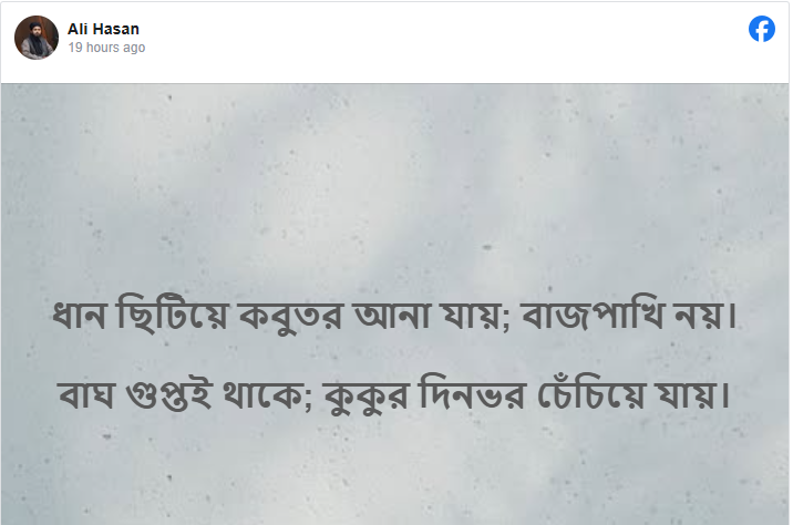স্ট্যাটাসে তিনি লেখেন, “ধান ছিটিয়ে কবুতর আনা যায়; বাজপাখি নয়। বাঘ গুপ্তই থাকে; কুকুর দিনভর চেঁচিয়ে যায়।” সরাসরি কারও নাম উল্লেখ না থাকলেও বক্তব্যটি ঘিরে অনলাইনে বিভিন্ন ব্যাখ্যা ও আলোচনা শুরু হয়। অনেক ব্যবহারকারী এটিকে তাৎপর্যপূর্ণ বার্তা হিসেবে দেখছেন।