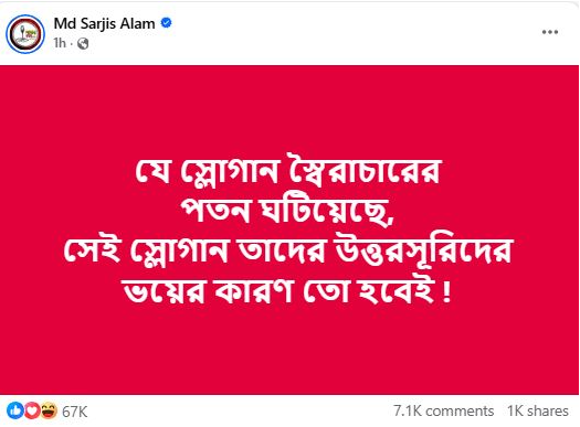 শনিবার (২১ ফেব্রুয়ারি) নিজ নিজ ভেরিফায়েড ফেসবুক আইডি থেকে পৃথক পোস্ট দেন তারা। সারজিস আলম রাত ৮টা ১০ মিনিটে স্ট্যাটাস দেন, যেখানে তিনি লেখেন, “যে স্লোগান স্বৈরাচারের পতন ঘটিয়েছে, সেই স্লোগান তাদের উত্তরসূরিদের ভয়ের কারণ তো হবেই!”
