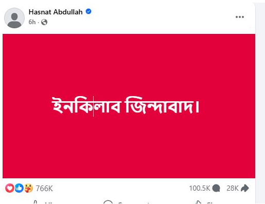 এর আগে শনিবার ইফতারের পর, সন্ধ্যা ৬টা ১৬ মিনিটে হাসনাত আবদুল্লাহ ‘ইনকিলাব জিন্দাবাদ’ লিখে মাত্র দুটি শব্দের স্ট্যাটাস দেন। এটি প্রকাশের সঙ্গে সঙ্গে সামাজিক যোগাযোগমাধ্যমে দ্রুত ভাইরাল হয়। সমর্থক ও সমালোচক উভয় পক্ষ পোস্টটি নিয়ে নানা প্রতিক্রিয়া দেখান।